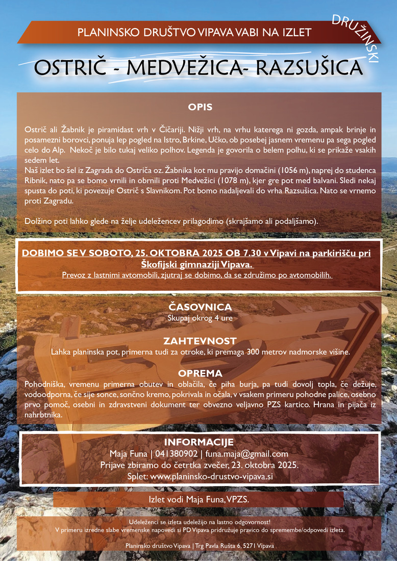 V primeru izredne slabe vremenske napovedi si, PD Vipava pridružuje pravico do spremembe/odpovedi izleta.