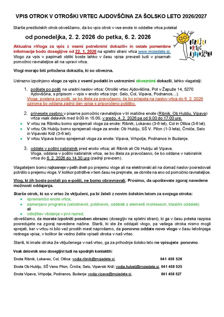 VPIS OTROK V OTROŠKI VRTEC AJDOVŠČINA ZA ŠOLSKO LETO 2026/2027