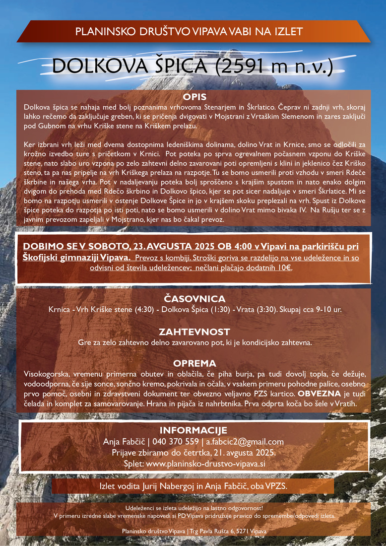 Izlet vodita vodnika PZS: Jurij Nabergoj in Anja Fabčič: a.fabcic2@gmail.com/ 040370559. Prijave do četrtka.