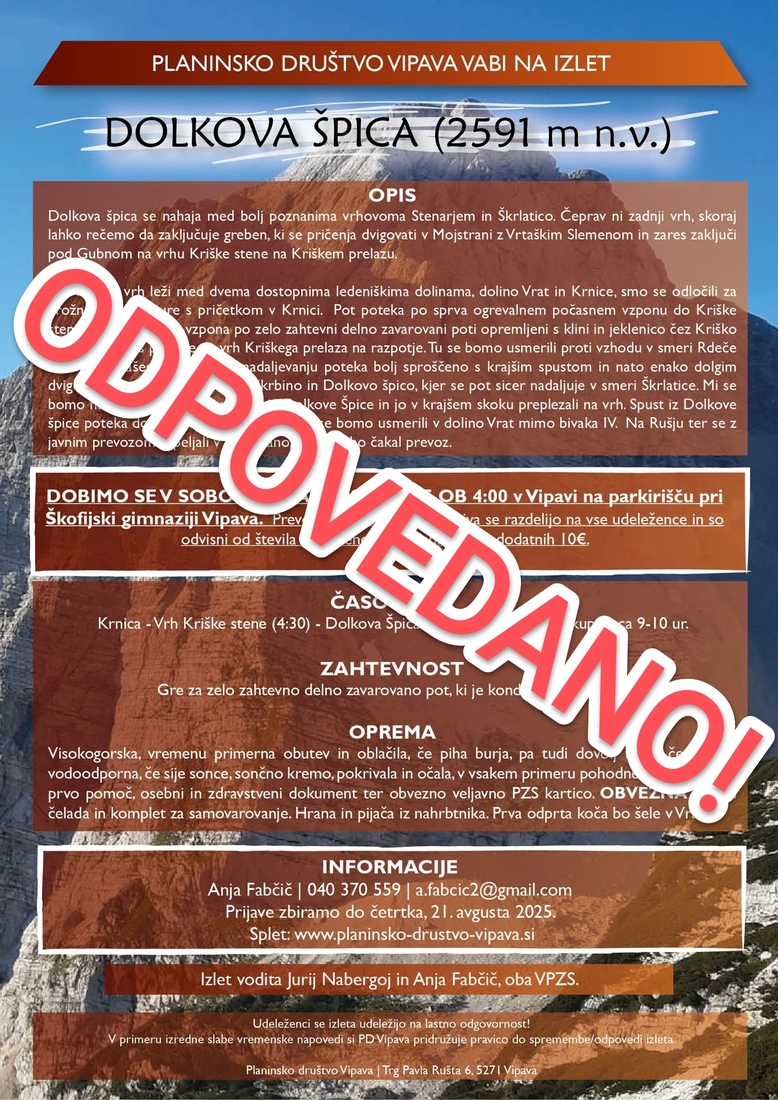 V primeru izredne slabe vremenske napovedi si, PD Vipava pridružuje pravico do spremembe/odpovedi izleta.